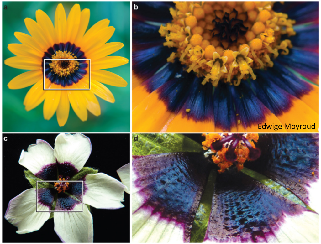 Many flowers have a textured surface, with ridges on the cells of the petal. Just as the ridges of a CD produce a rainbow effect, they reflect light; unlike on a CD, the ridges are disordered, meaning the light they reflect is a blue sheen, or ‘halo’.