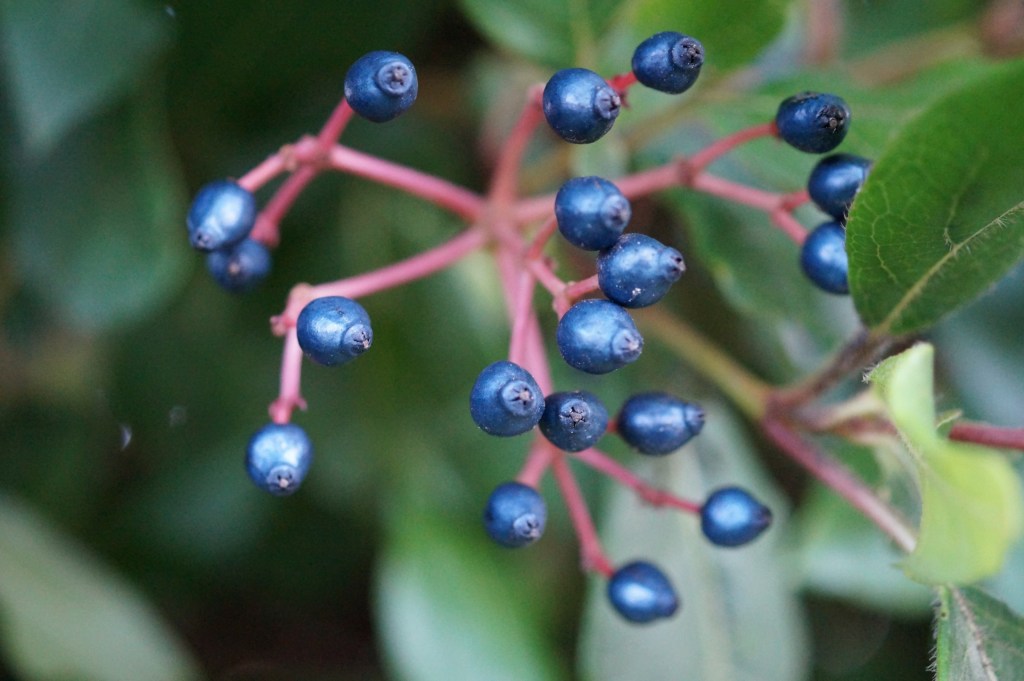 Viburnum tinus is a popular garden shrub in the UK. In the winter it has beautiful shiny blue berries that look almost metallic. How do they do it? They don’t actually have any blue pigment in the fruits, but they have extraordinary structures in the outer cells’ surfaces, with globules of lipids inserted inside the cell walls in layers. It’s those layers that make the beautiful shiny blue.